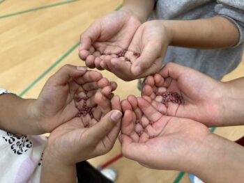 「大根にも大きな大根と小さな大根があります。何でだと思いますか?」との問いかけに、子ども達から、「諦めたから‼︎日が当たっていないから‼︎」等答えていました。