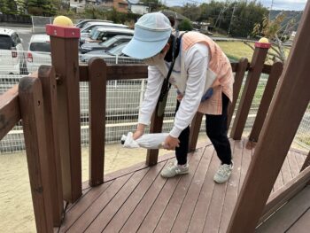 沢山滑ったすべり台、沢山使った階段、のぼり棒等に塩・お酒・神様のお水をまいて、感謝の気持ちを伝えました。