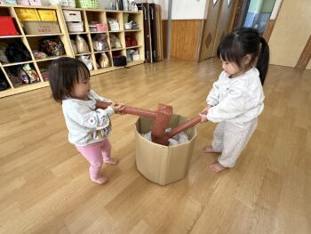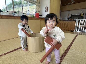 ちゅーりっぷ・ゆり組さんはお部屋で先生達が作った杵と臼でもちつきをしました![]()
