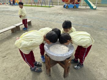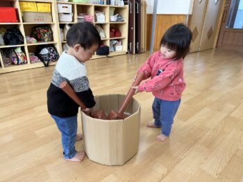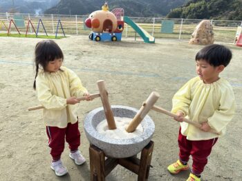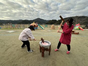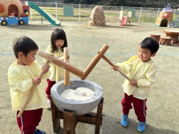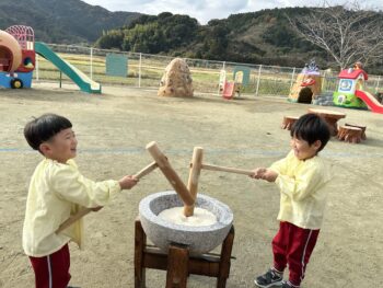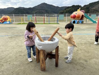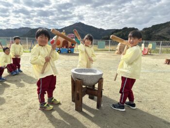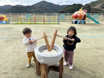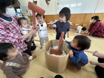 杵をもってお友達と仲良く「ぺったんぺったん」と言いながら、きねときねがぶつからないように気を付けながらもちつきを楽しんでいました![]()