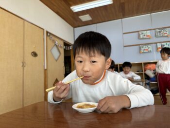 給食前につきたてのお餅を頂きました。つきたてのお餅はやわらかくて、とろとろしていて、美味しすぎてほっぺが落ちそうでした。