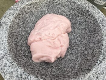●ひまわり・すみれ・さくら組のお友達はつく前の出来立てのもち米を味見しました。食べたお友達は「うーん、美味しい!」と言いながら食べたり「いつも食べているお米と違う!いい匂いがする、甘い味がする」等いつも食べている白米との違いにびっくりしていました。あまりにも美味しすぎて、何度も出来立てのもち米をおかわりするお友達がいましたよ。