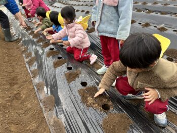 「じゃが芋の芽を上に向けて、土を優しくかけて下さい。」と教えてもらい、「はい‼︎」と元気にお返事が出来ていましたよ。